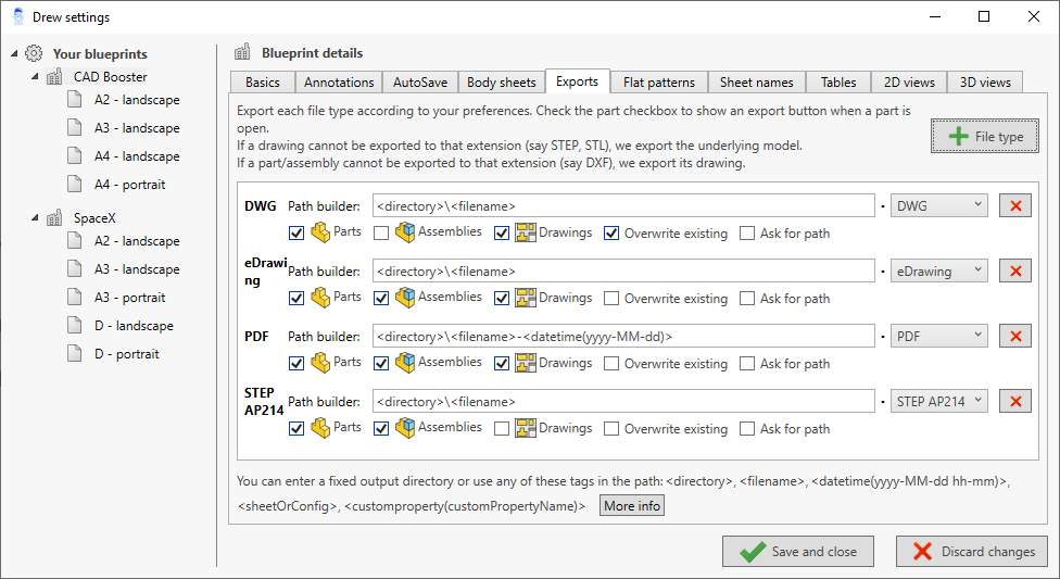 Drew can choose an export folder and filename for you. For more information, check out Smart export – use custom properties, sheet names, dates.