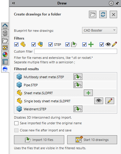 With Drew, you import up to ten files at once. Why ten? To prevent SOLIDWORKS from going on until it crashes.