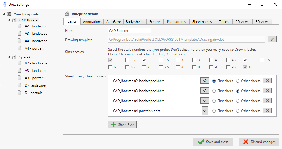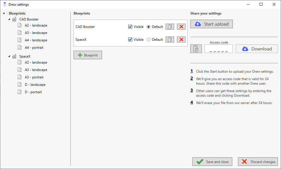 Drew create Blueprints to store your drawing preferences regarding templates, sheet formats, views, dimensions, blocks and others.